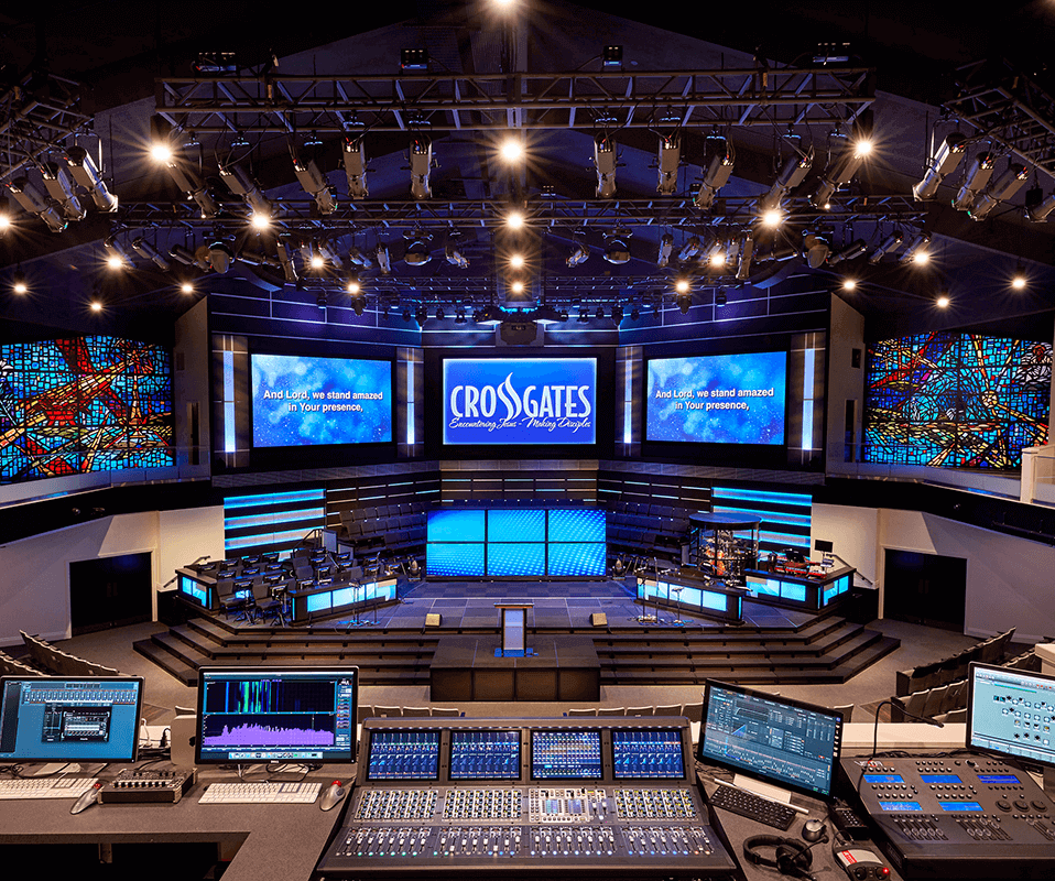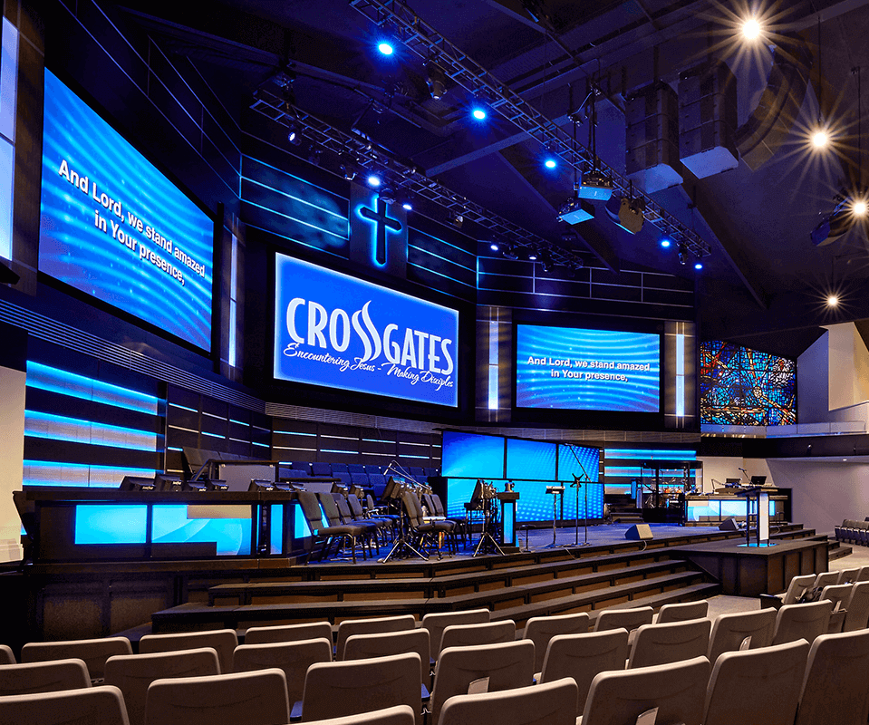 該工程采用了一塊強力巨彩8.6㎡的Q1.2大屏,左右兩邊各配置了一只EAJAX 采用DANTE接口的雙6寸POE音箱,整... -